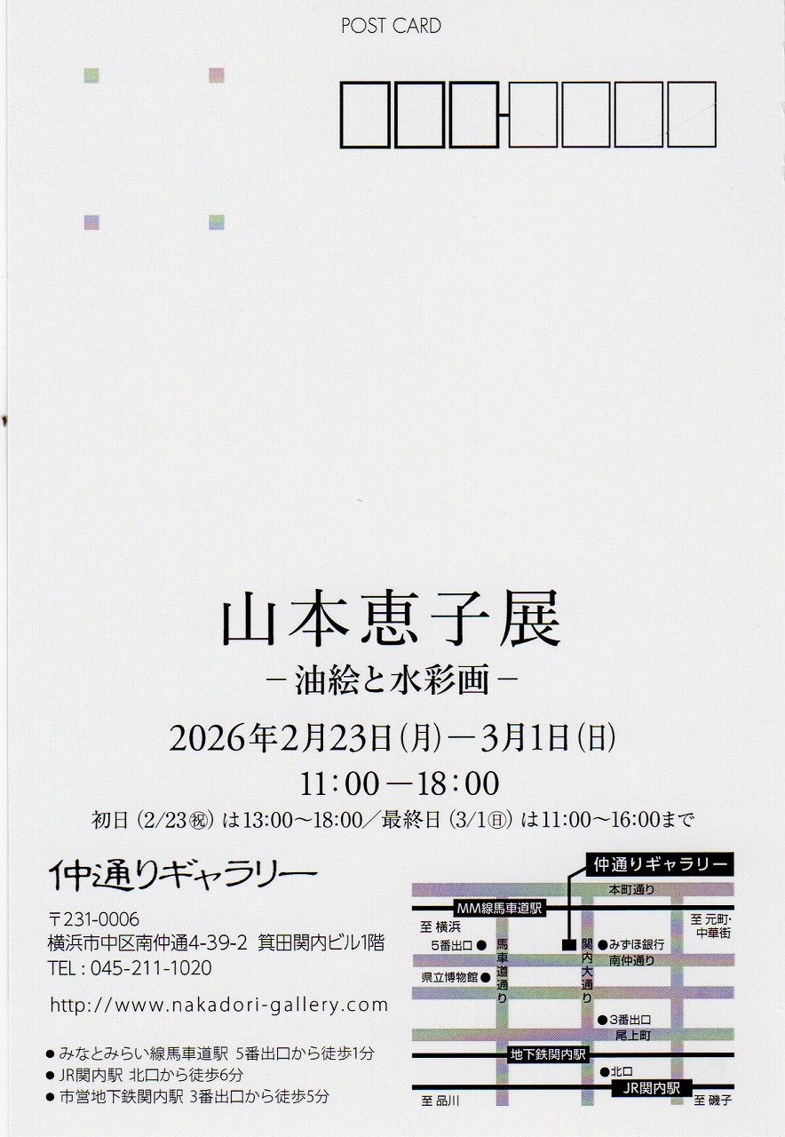 ホーム > 未分類 > 山本恵子展 ー油彩と水彩画ー 2月23日(月)から3月1日(日) 11:00-18:00 最終日は16:00まで