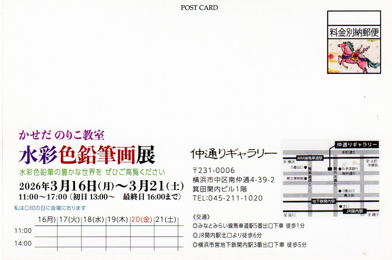 かせだのりこ教室 水彩色鉛筆画展 3月16日(月)-21日(土) 11:00-17:00 初日13:00から